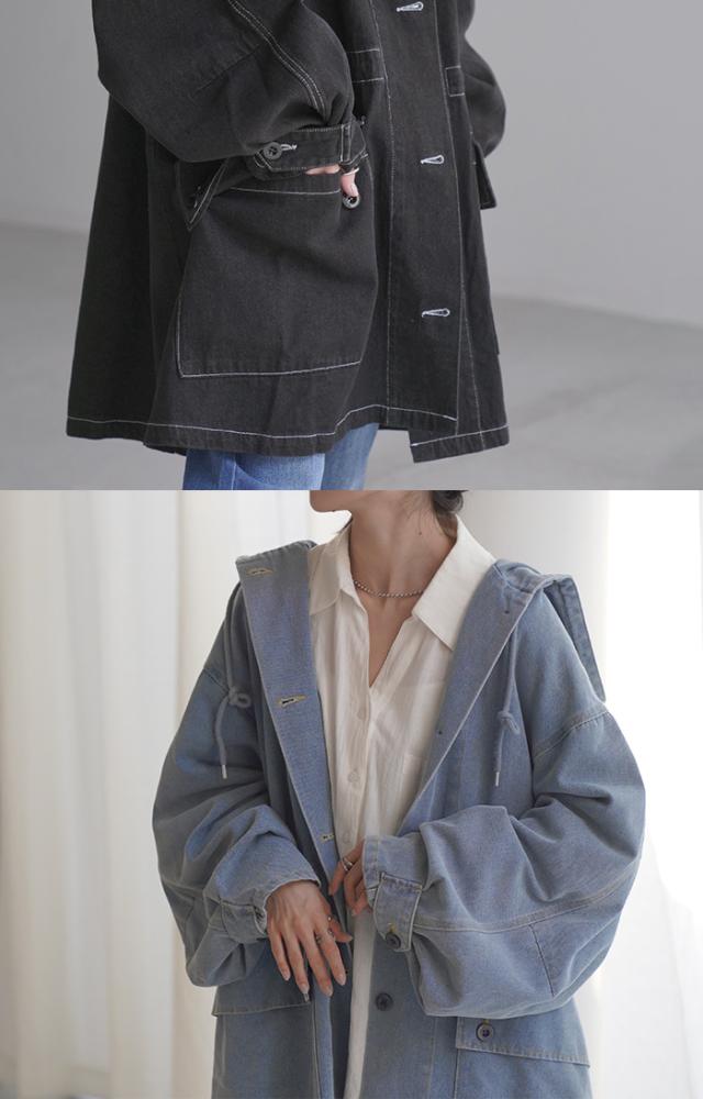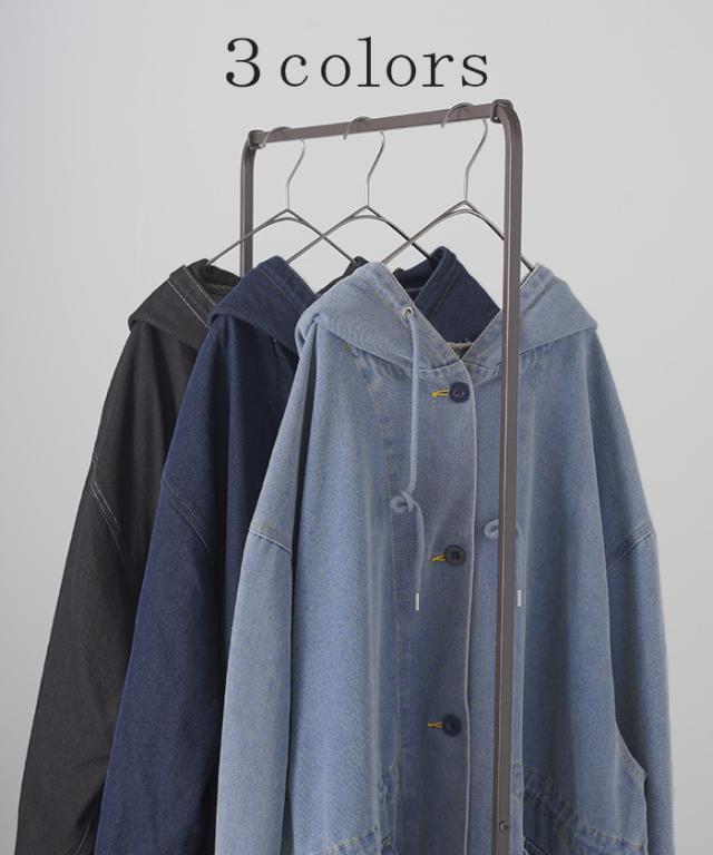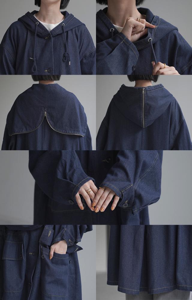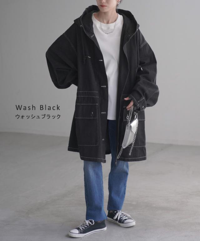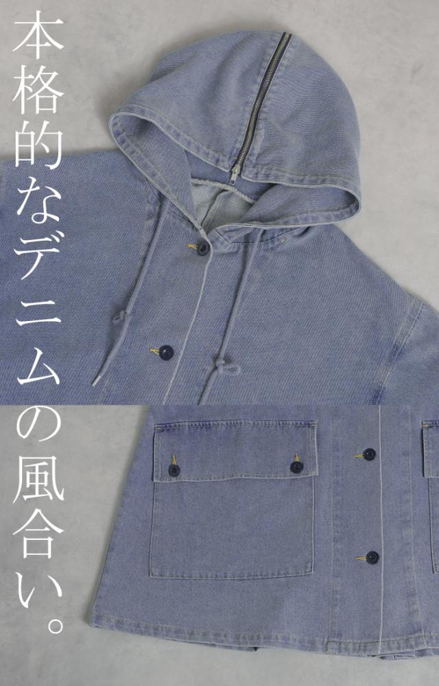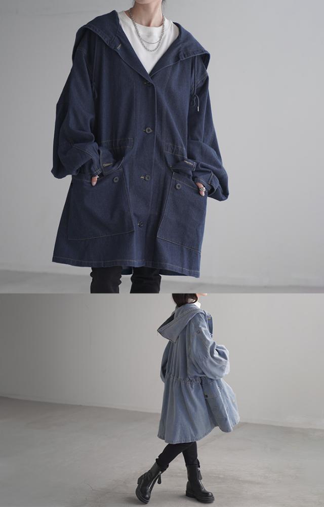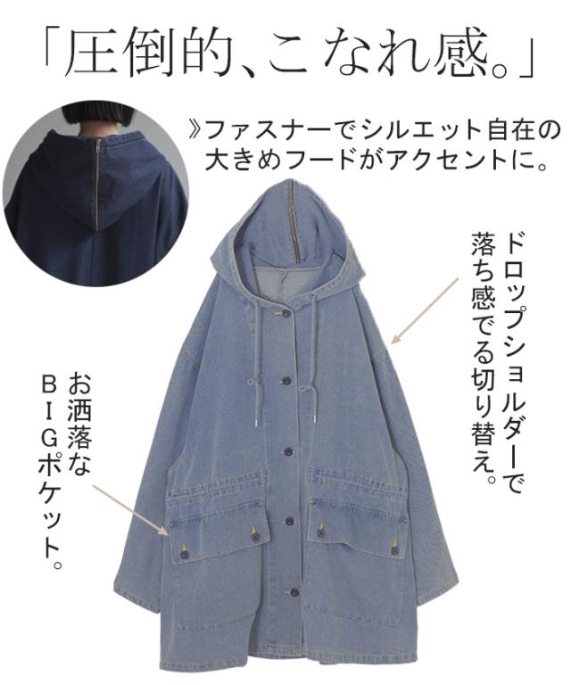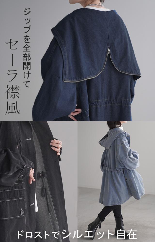 大きなフードが特徴的なミリタリーデニムジャケットです。
