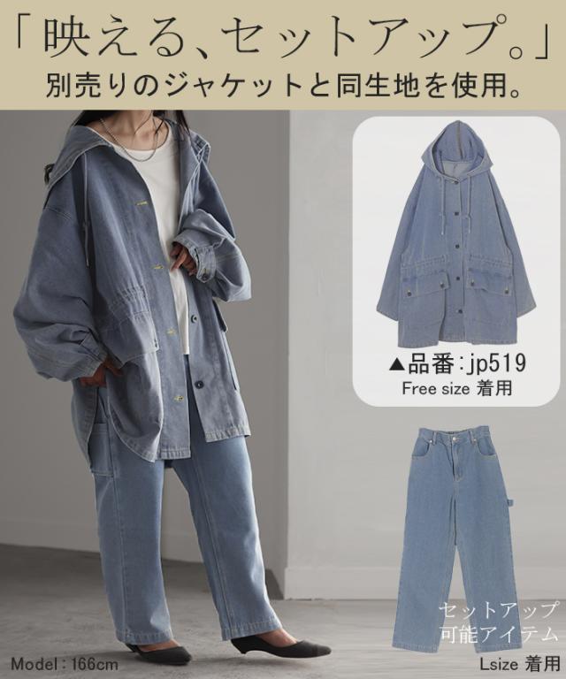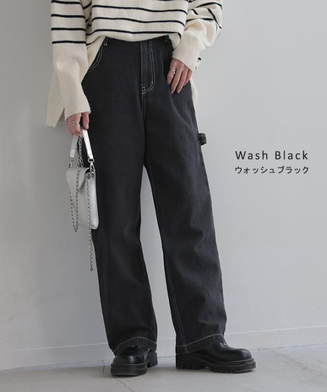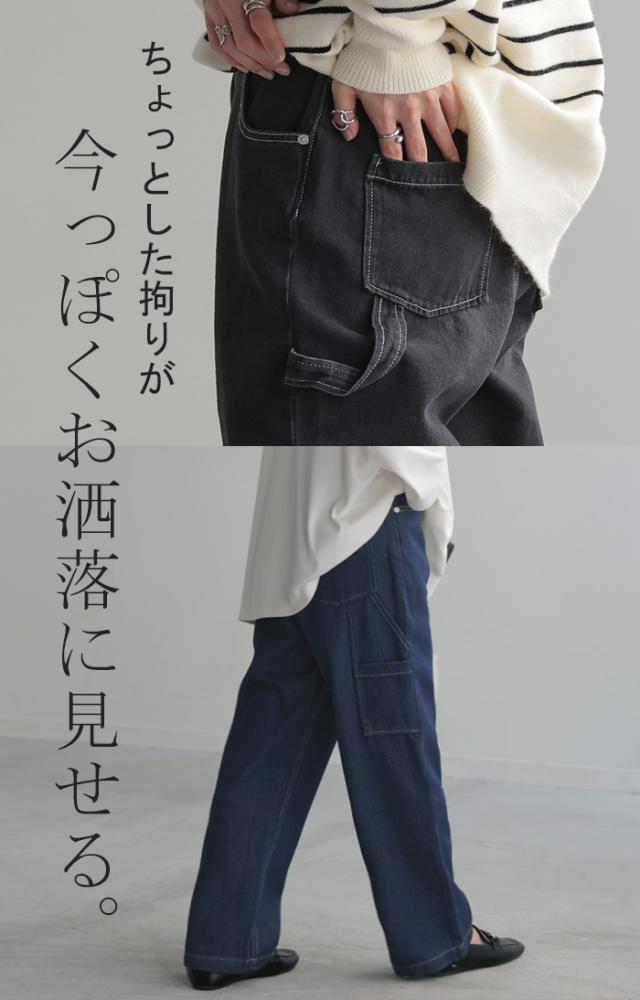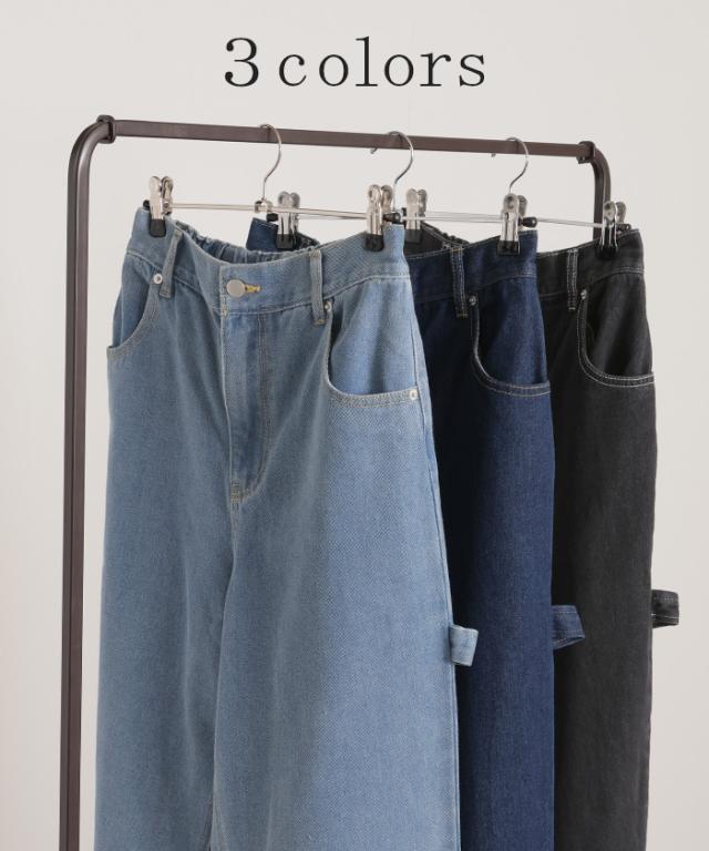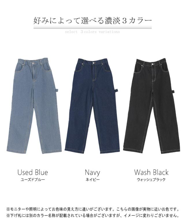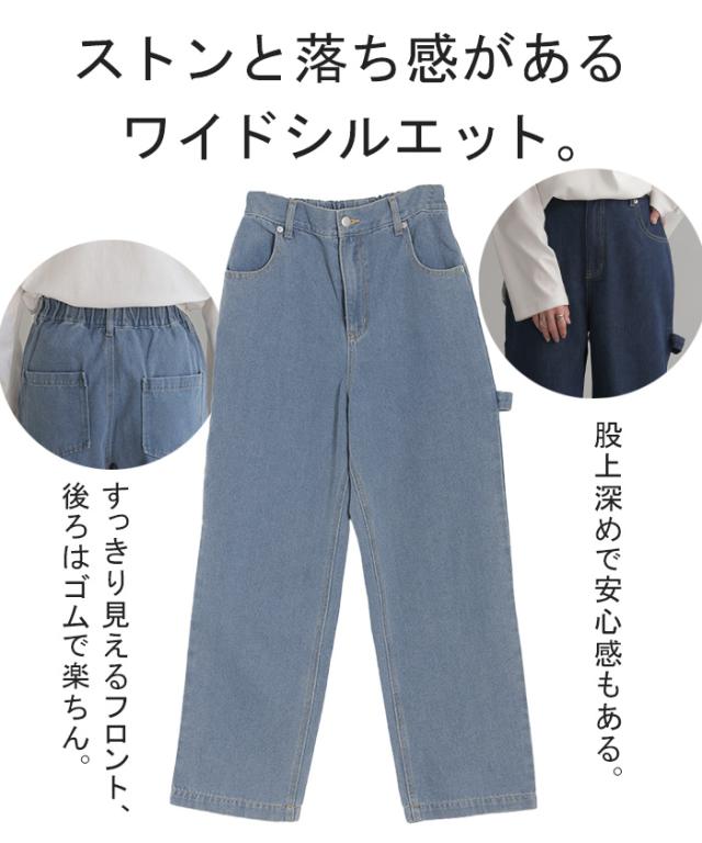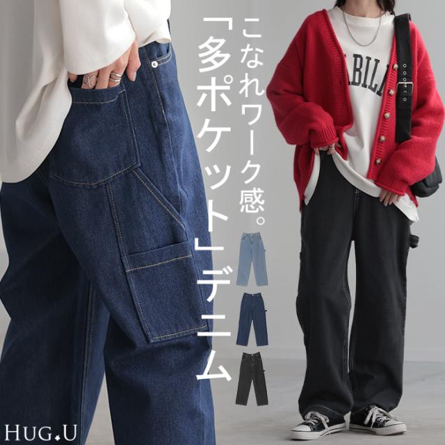 パンツ 別売り セットアップ可 デニム ワイド レディース ボトムス ワイドパンツ ペインターパンツ ハイウエスト ウエストゴム ジーンズ ジーパン ボトム 長 ロング ズボン ストレート ポケット ステッチ 綿 大きいサイズ 体型カバー 黒 春 夏 HUG.U 秋新作