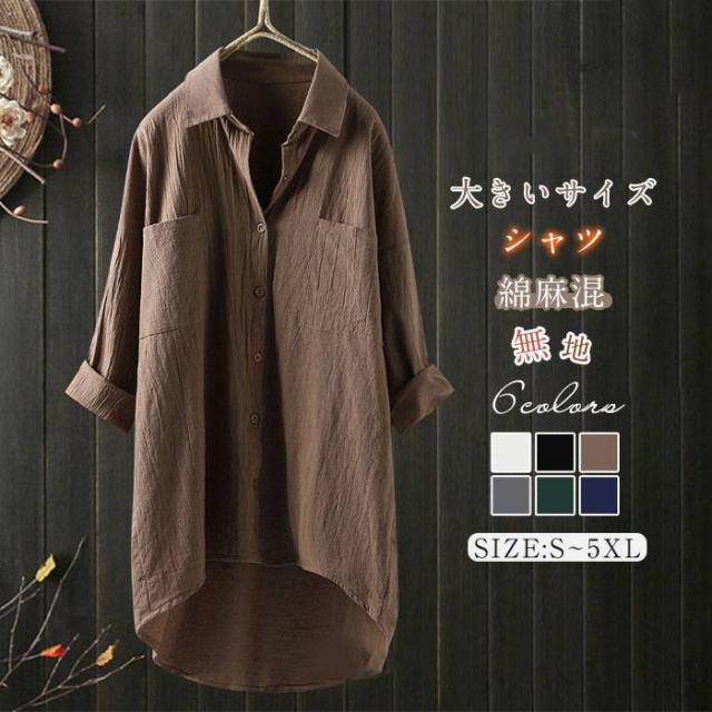 シャツ ブラウス レディース 長袖 ミドル丈 韓国風 綿麻混 ゆったり リネン長袖 スタンダードカラー シャツブラウス リネンシャツ 大きいサイズ オフィス