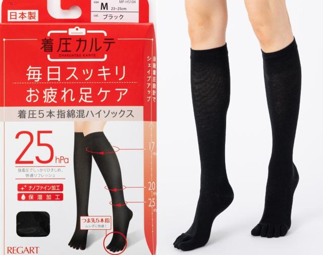 日本製 着圧5本指ソックス 膝下 靴下 レディース ひざ下 綿 ハイソックス つま先5本指 美脚 むくみ対策 強着圧 25hpa ムレ対策 快適 爽やか 丈夫 着圧カルテ リカバリー 春