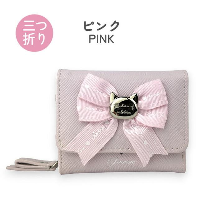 大きなリボンとネコのブローチがとってもかわいい三つ折り財布。