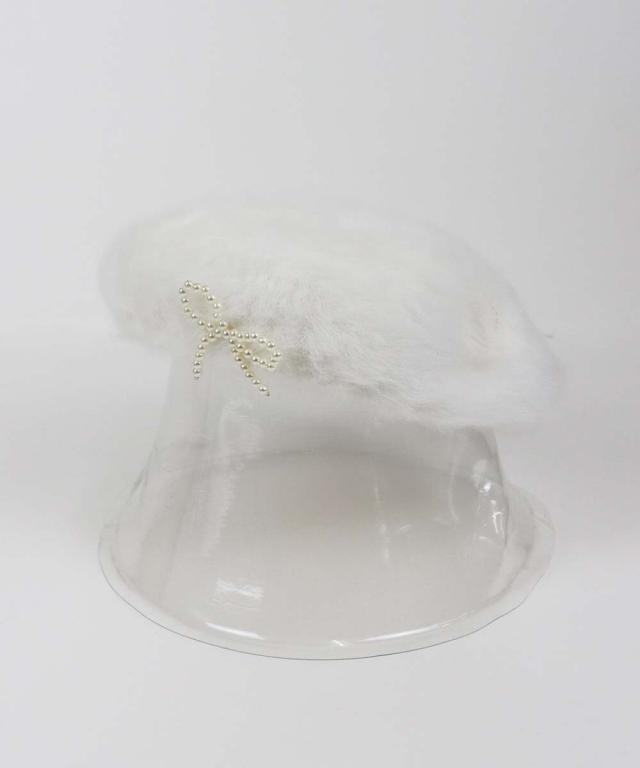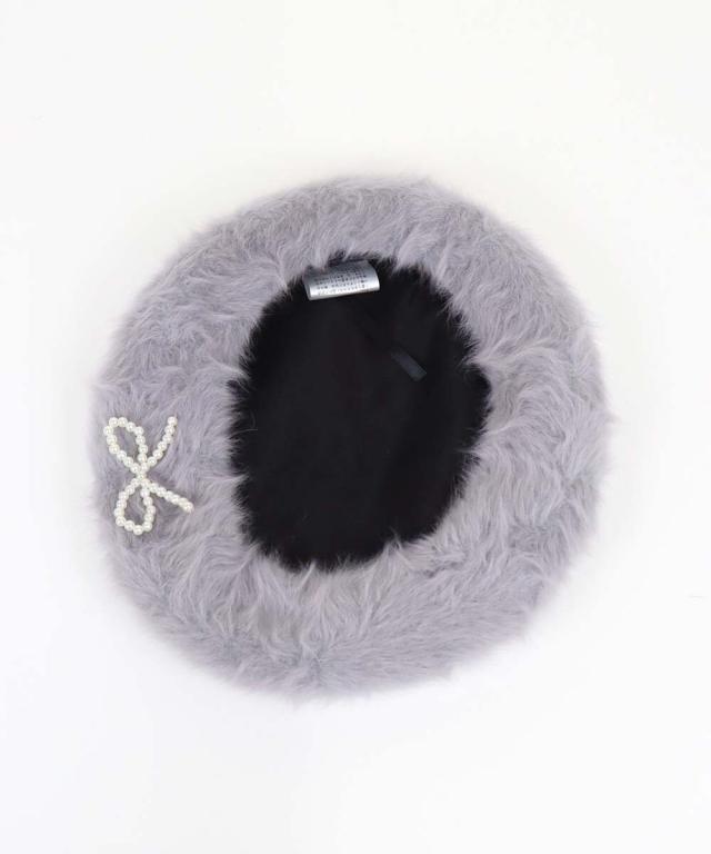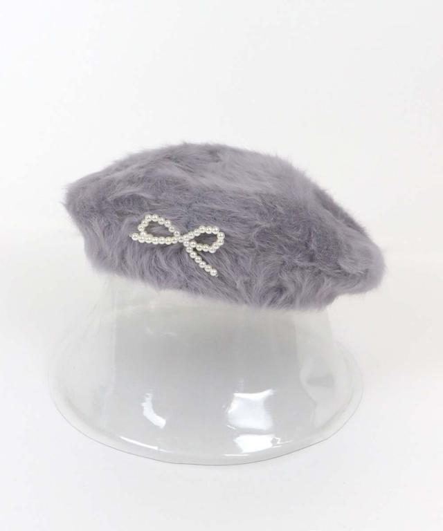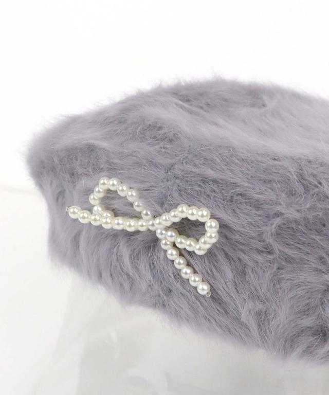 ふわふわのファーにパールリボンを付けたフェミニンなベレー帽