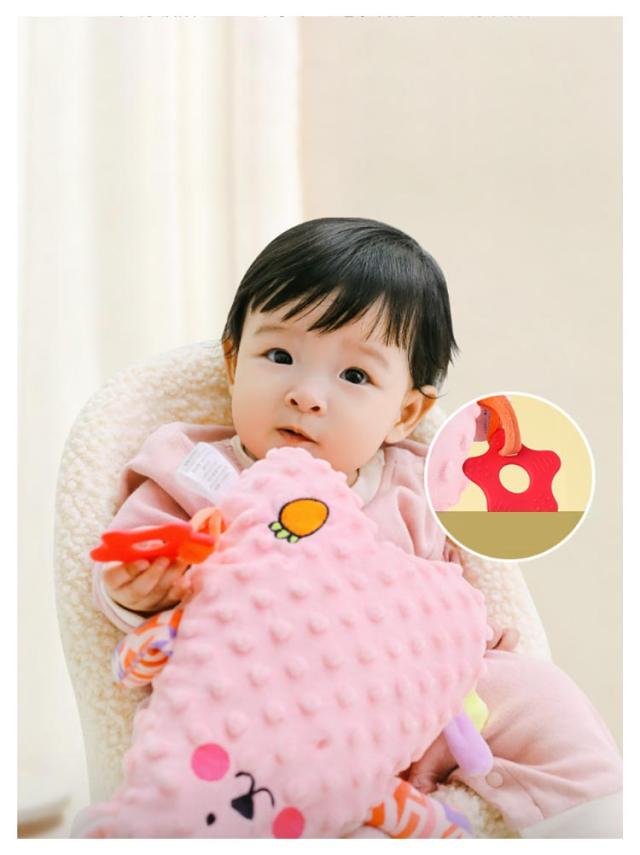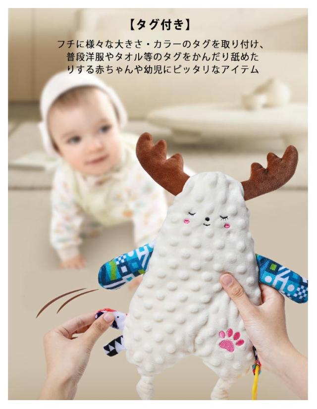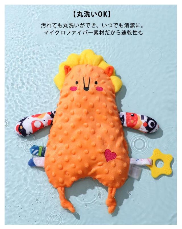 | 丸洗い◎ ふわふわ優しい極上の肌触り♪ 赤ちゃんの歯固め付きミニブランケット <お勧めポイント> 【タグ付き】 ・フチに様々な大きさ・カラーのタグを取り付け、普段洋服やタオル等のタグをかんだり舐めたりする赤ちゃんや幼児にピッタリなアイテム♪ 【ふんわりなめらか】 ・タオル地はマイクロファイバー素材を採用し、お子様がずっと触りたくなるようなふんわりなめらかな手触りなのも嬉しいポイント。 【指先の運動にも】 ・ポコポコとした凹凸が特徴的。潰して指先や触覚の運動できるのも嬉しいポイント。 【お出かけのお供に】 ・お出かけ先のおもちゃにも最適☆ベビーカーに取り付けたり、チャイルドシートに置いておけばぐずり対策にも最適☆ 【丸洗いOK】 ・汚れても丸洗いができ、いつでも清潔に。マイクロファイバー素材だから速乾性も◎ | |