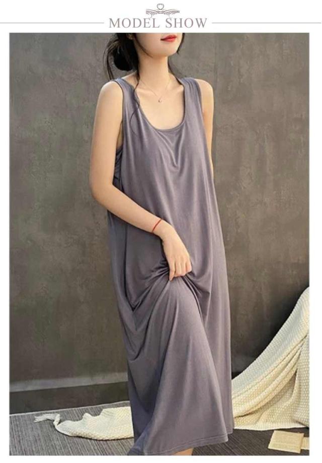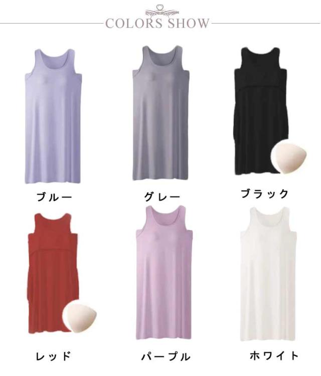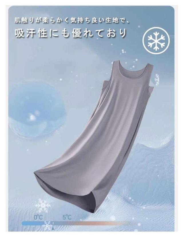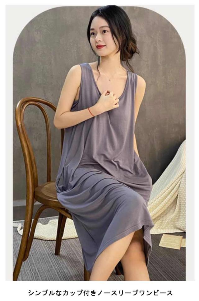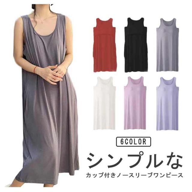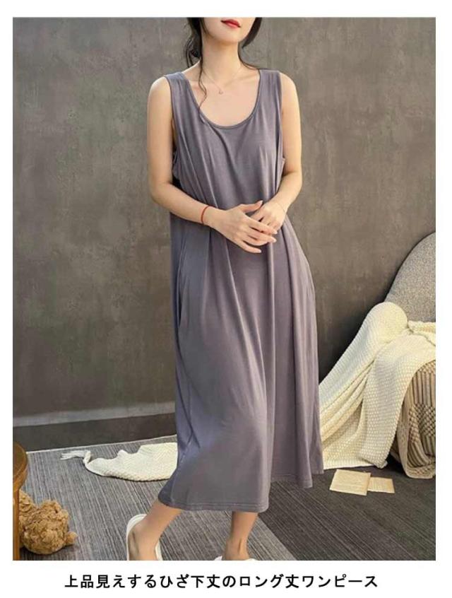 | シンプルなカップ付きノースリーブワンピース 汗をかいてもサッと吸収してくれるので蒸れにくく、お風呂上りにも気持ちの良い素材です 肌触りが柔らかく気持ち良い生地で、吸汗性にも優れており 上品見えするひざ下丈のロング丈ワンピース 部屋着としても肌着としてもお使いいただけます | |