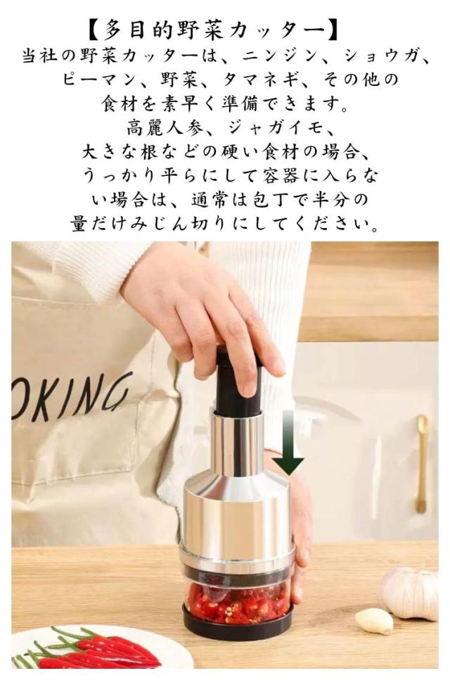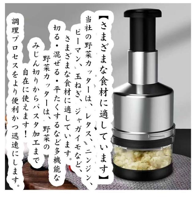 | 手動野菜チョッパーガーリックマッシャーの刃はステンレス製です。デリケートなブレードは、錆びにくく、変形しにくく、錆びにくく、耐衝撃性、耐摩耗性、耐久性に優れています。 【お手入れが簡単】プレスガーリックチョッパークラッシャーは電気メッキ加工されており、滑らかで明るい外観で汚れを効果的に防ぎ、フードチョッパーのお手入れも簡単です。また、手動フードチョッパーは簡単に分解できるので、流水で2分で簡単に掃除できます。 【さまざまな食材に適しています】当社の野菜カッターは、レタス、ニンジン、ピーマン、玉ねぎ、ジャガイモなど、さまざまな食材に適しています。 切る・混ぜる・平たくするなど多機能な野菜カッターは、野菜のみじん切りからパスタ加工まで自在に使えます! 調理プロセスをより便利かつ迅速にします。 【多目的野菜カッター】当社の野菜カッターは、ニンジン、ショウガ、ピーマン、野菜、タマネギ、その他の食材を素早く準備できます。 高麗人参、ジャガイモ、大きな根などの硬い食材の場合、うっかり平らにして容器に入らない場合は、通常は包丁で半分の量だけみじん切りにしてください。 【丈夫で耐久性】野菜カッターはステンレス鋼の刃を採用しており、丈夫で耐久性があり、効率的に食材を切ることができます。 カップの内側は食品グレードのプラスチックで作られており、食品の安全性、堅牢性、バクテリアの防止を保証します。 | |