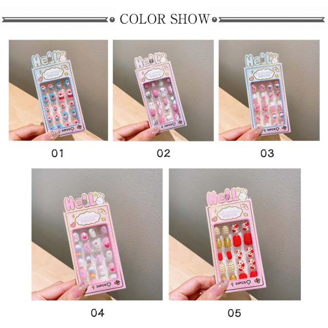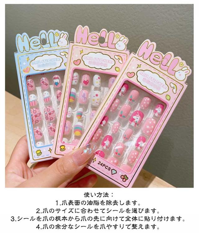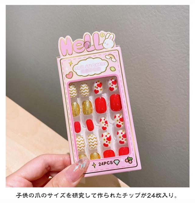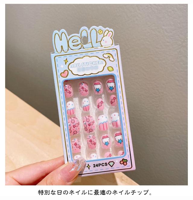 | 【子供用ネイルチップ】【24枚入】【全10種】 子供と一緒に楽しいネイル遊びをしてください。 特別な日のネイルに最適のネイルチップ。 自爪につけるだけで指先のオシャレが簡単に! 子供の爪のサイズを研究して作られたチップが24枚入り。 使い方法: 1.爪表面の油脂を除去します。 2.爪のサイズに合わせてシールを選びます。 3.シールを爪の根本から爪の先に向けて全体に貼り付けます。 4.爪の余分なシールを爪やすりで整えます。 | |