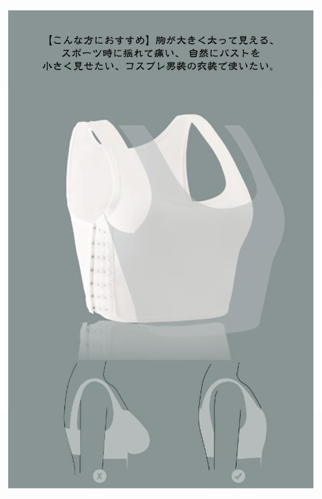 | 2枚セット!【胸つぶし インナー】【M〜3XL】 【バストを自然に小さく見せる】胸つぶしシャツがバストを自然に潰す事で美しいシルエットに見せます。 【3列ホックで調整可能】バストの抑え具合を3つのホックで調整が可能です。 苦しくないよう好みの締め付け具合でご着用ください。 【着心地の良い素材と仕様】通気性の高いメッシュの使用と幅広く設計された肩の仕様で、ムレをおさえ、快適な着けごこちです。 【こんな方におすすめ】胸が大きく太って見える、スポーツ時に揺れて痛い、 自然にバストを小さく見せたい、コスプレ男装の衣装で使いたい。 着物(和装)を着られるときにも胸つぶしは重宝します! | |