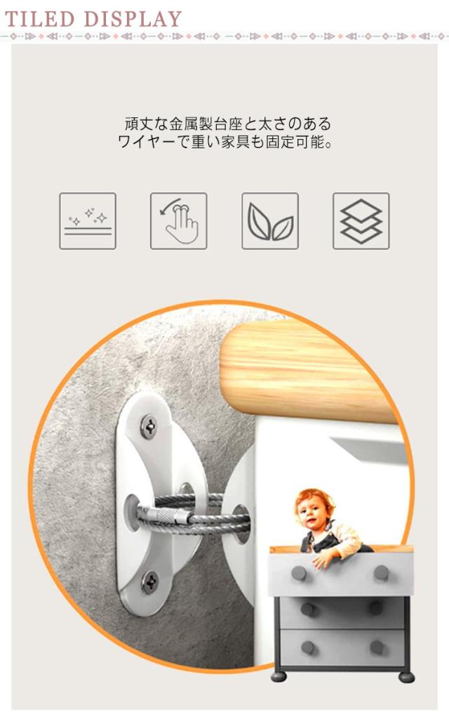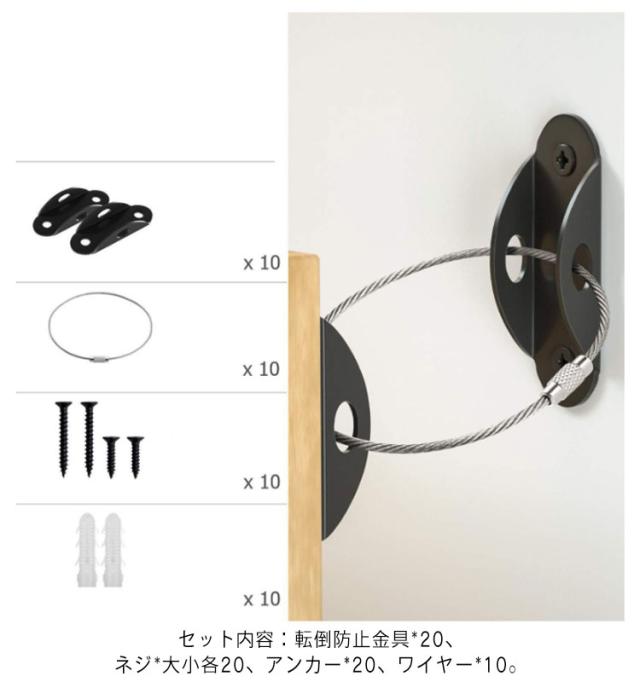 | 家具転倒防止ストッパー・10組セット。 頑丈な金属製台座と太さのあるワイヤーで重い家具も固定可能。 壁と家具を繋いでしっかり固定!地震の揺れ、お子様やペットが登って倒れそうな食器棚、本棚、タンス、突っ張りラック、テレビラック、脚立、大型ラック、コーナーラック、収納棚など家具をしっかり固定。 コンパクトスリムなデザイン、設置してもお部屋のインテリアを損ねない。目立ちにくくてもガッチリ固定。 固定物に合わせて、片側固定と両側固定の2way固定方法。 セット内容:転倒防止金具*20、ネジ*大小各20、アンカー*20、ワイヤー*10。 | |
