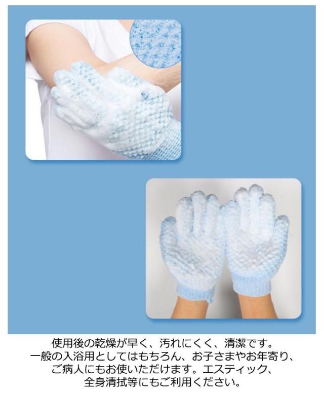 | 手足の指の間などの細かいところもしっかり洗える手袋型タオル。 指先を使って、からだのすみずみまで、きれいに洗えます。また、指圧マッサージも同時にでき、使用後は爽快です。 袖口は伸縮性のあるデザインで脱落しにくいです! 泡立ち機能もあり、毛穴の皮脂と汚れを清潔にする。 使用後の乾燥が早く、汚れにくく、清潔です。一般の入浴用としてはもちろん、お子さまやお年寄り、ご病人にもお使いただけます。エスティック、全身清拭等にもご利用ください。 | |