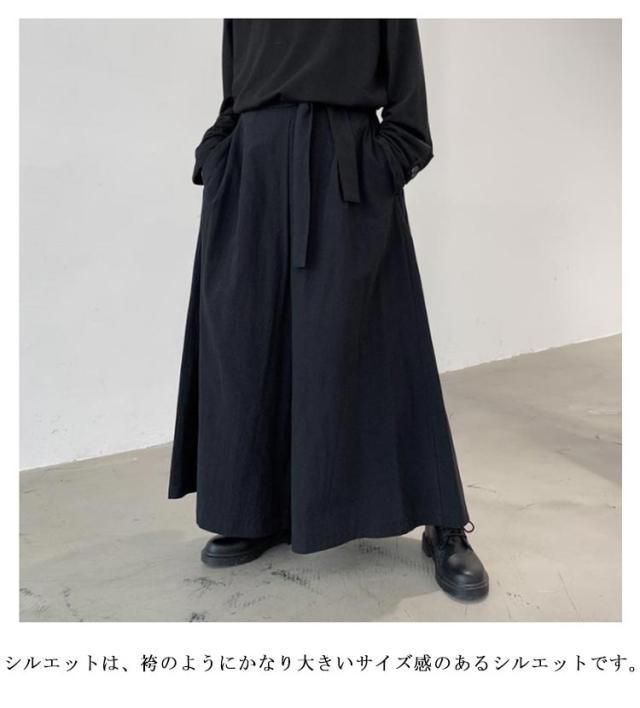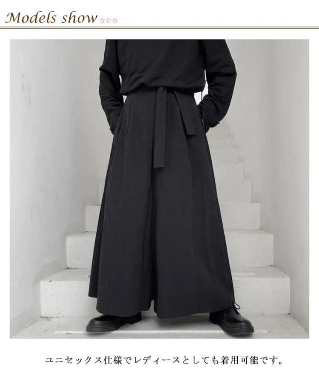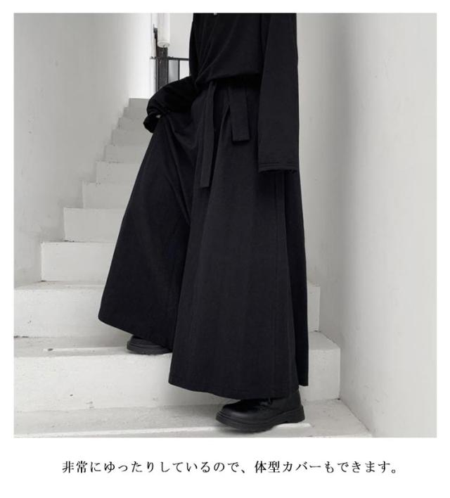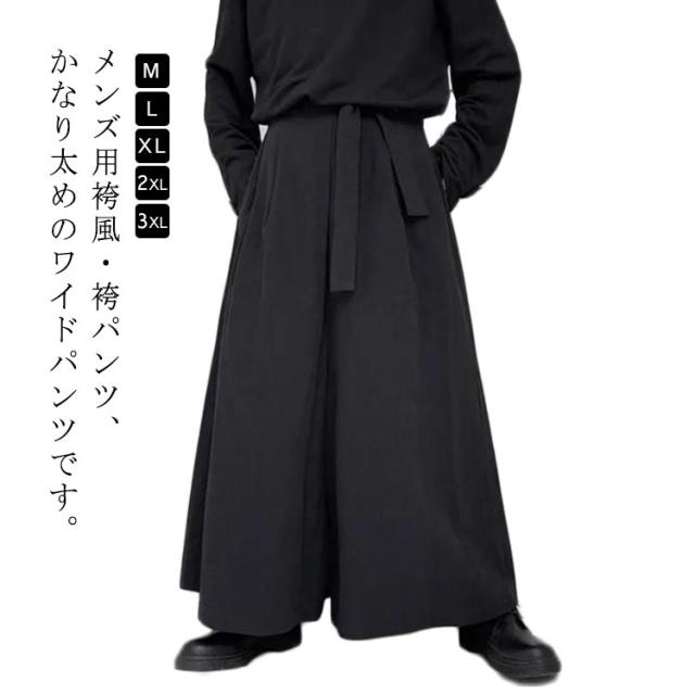 | メンズ用袴風・袴パンツ、かなり太めのワイドパンツです。 かっこいいをコンセプトとした、ゆったりおしゃれ で シックなモード系や 変形 v系 ゆったりした ゆるい レイヤードファッション等に良く合います。 ユニセックス仕様でレディースとしても着用可能です。 シルエットは、袴のようにかなり大きいサイズ感のあるシルエットです。 ガウチョパンツやサルエルパンツにも近いですが、丈はガウチョより長く、サルエルのように裾は締まっていません。 非常にゆったりしているので、体型カバーもできます。 イージーパンツの様に、ウエストは一部背面にゴムが入っているため、ウエストに窮屈感を感じることもないかと思います。 緩い場合は、備え付けの紐(リボンベルト)で縛って頂けば、ご自身のウエストにしっかり合うように調節できます。 | |