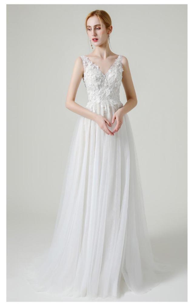 | 胸元に小花と刺繍がかわいいウエディングドレス。 ふんわりチュール素材で着心地もよい。 背中はファスナーで着脱ぎも簡単。 | |