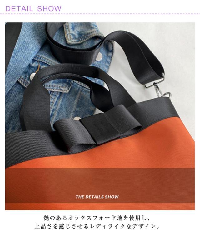 | 手提げ、肩掛け、斜め掛けの3WAYで使用できるアイデアバッグです。 大きめフラットリボンがオシャレな配色トートバッグ。 収納・便利!小銭入れ、スマホやハンカチ、化粧品、小物など問題なく収納できます、大きすぎるアイテムは保管に適していません。 艶のあるオックスフォード地を使用し、上品さを感じさせるレディライクなデザイン。 オンオフ兼用なので、普段使い〜オフィスシーン、旅行バッグなどマルチにお使いいただけます。 | |