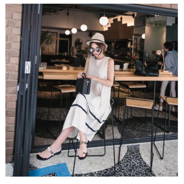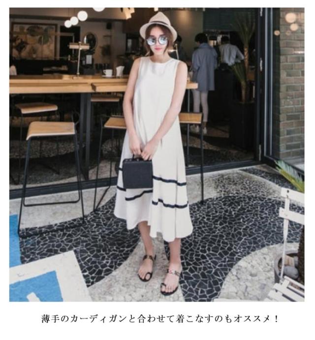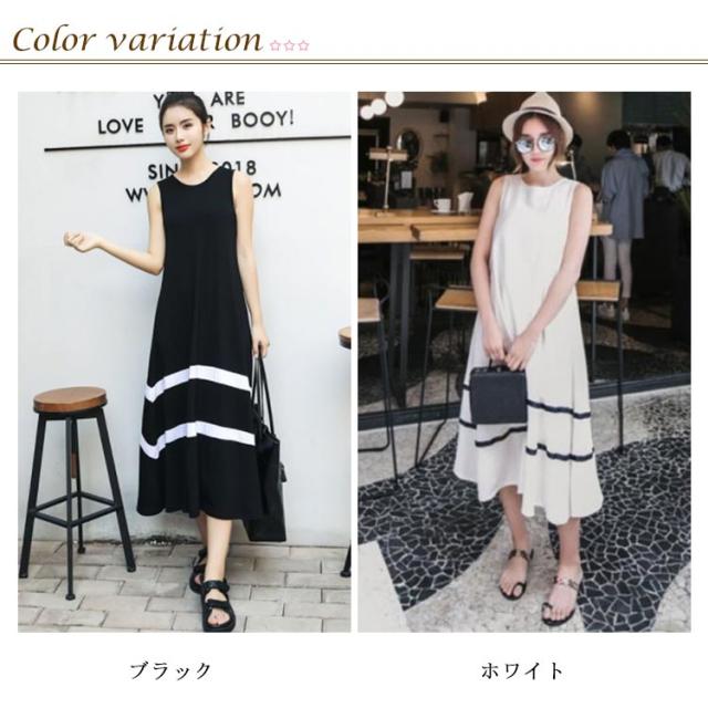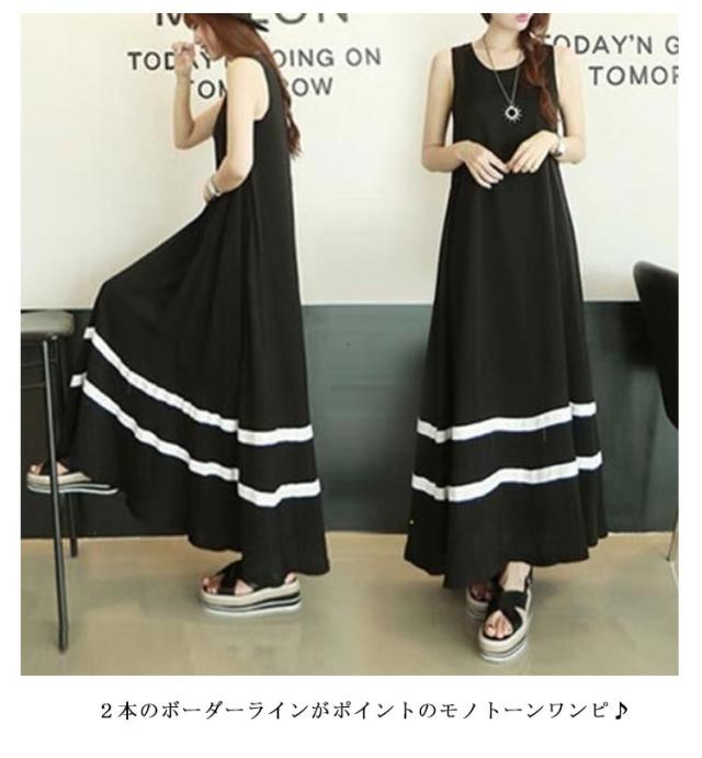 | ふわっとしたゆるシルエットのロング丈ノースリーブワンピです。 2本のボーダーラインがポイントのモノトーンワンピ♪ 肌触りの良いサラサラとした生地、 すとんと落ちるシルエットで体のラインが出にくいので体型カバーも◎ 薄手のカーディガンと合わせて着こなすのもオススメ! | |