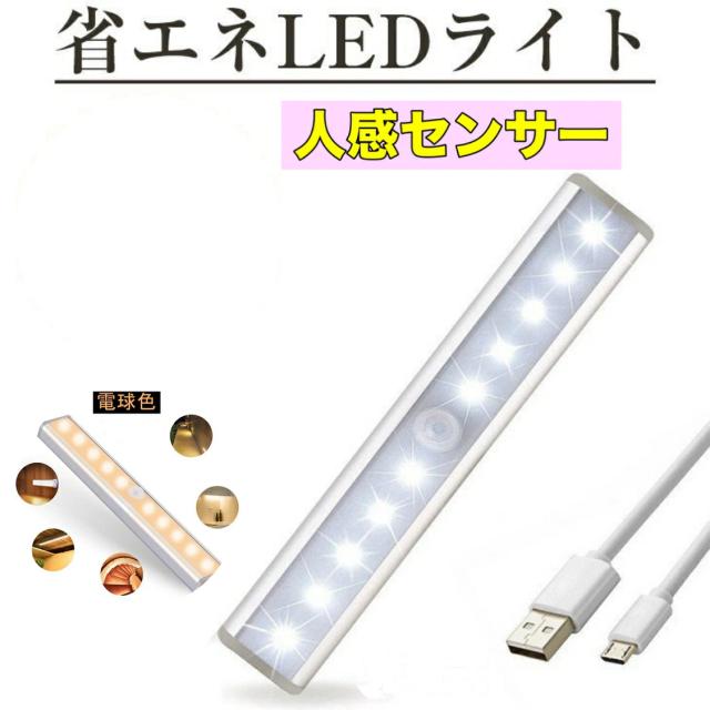 LED人感センサーライト 10LEDランプ 調整可能 USB充電式 省エネ 超寿命 高輝度 両面テープ 磁石マグネット付き 階段 足元灯 台所の手元灯クロゼット 寝室 玄関 洗面所 車庫 物置 廊下