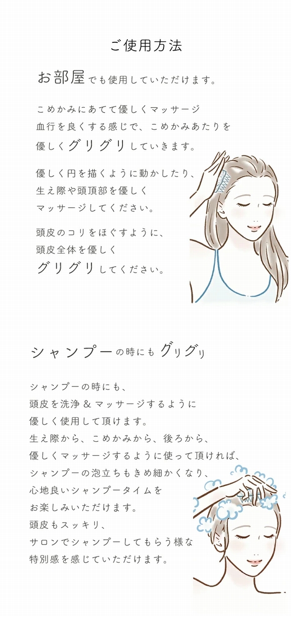| 使用方法 | ---こめかみにあてて優しくマッサージ--- お部屋でも使用していただけます。血行を良くする感じで、こめかみあたりを優しくグリグリしていきます。優しく円を描くように動かしたり、生え際や頭頂部を優しくマッサージしてください。頭皮のコリをほぐすように、頭皮全体を優しくグリグリしてください。 ---シャンプーの時にもグリグリ--- シャンプーの時にも、頭皮を洗浄&マッサージするように優しく使用して頂けます。 生え際から、こめかみから、後ろから、優しくマッサージするように使って頂ければ、シャンプーの泡立ちもきめ細かくなり、心地良いシャンプータイムをお楽しみいただけます。頭皮もスッキリ、サロンでシャンプーしてもらう様な特別感を感じていただけます。 |