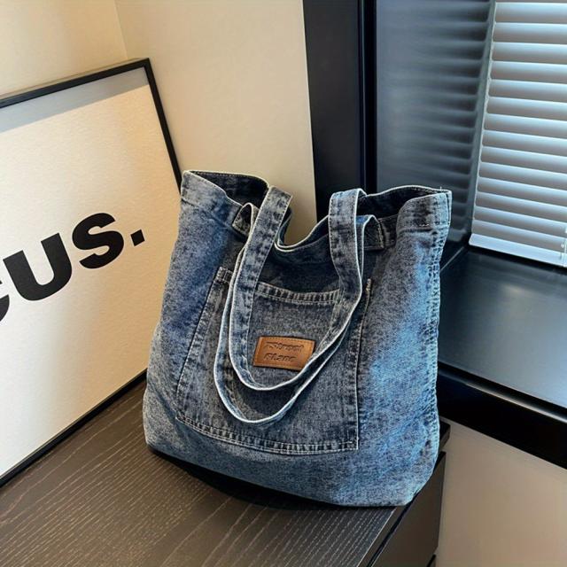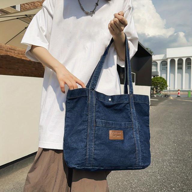 キャンバスショルダートートバッグ、大容量デニム無地ハンドバッグクラッチバッグ、シンプルな通勤ハンドバッグ