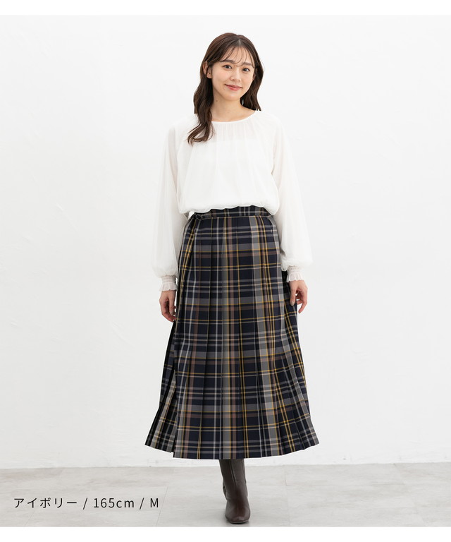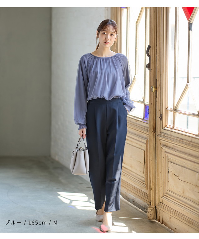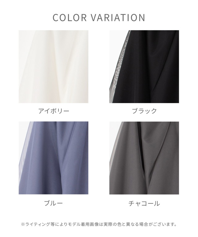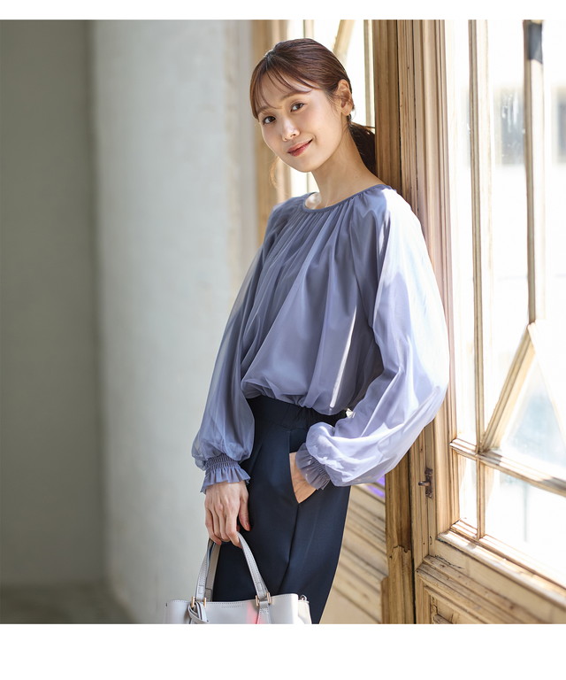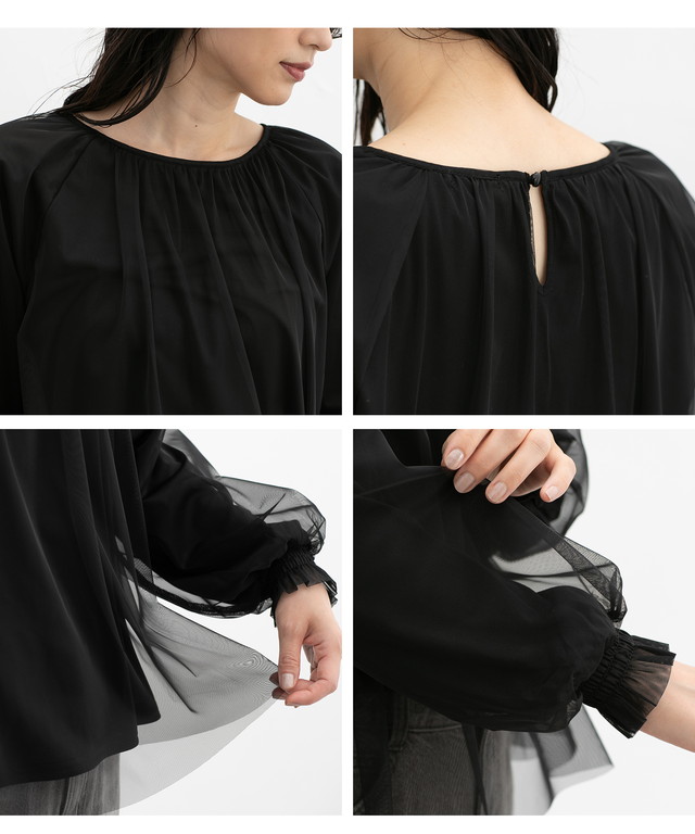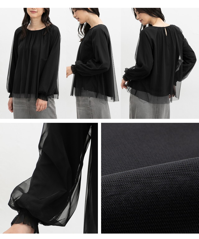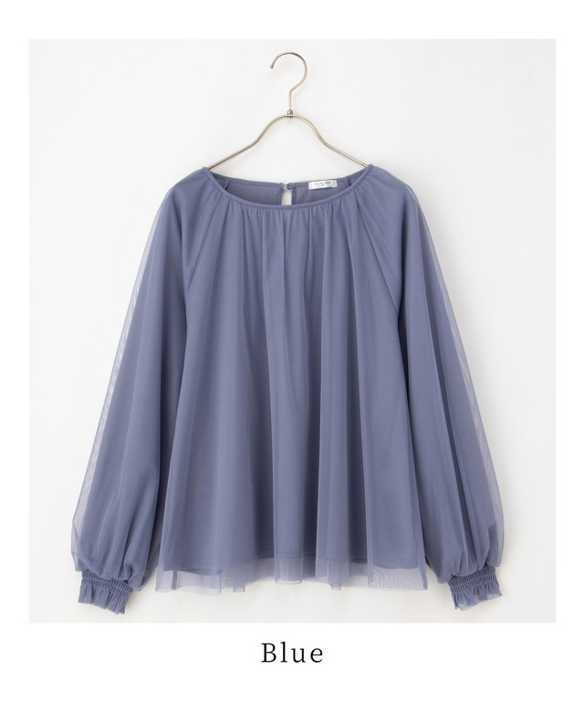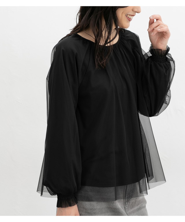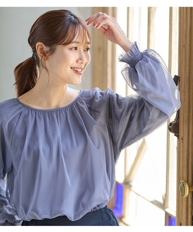 チュール使いとふんわりボリューム袖が大人可愛いデザイン。