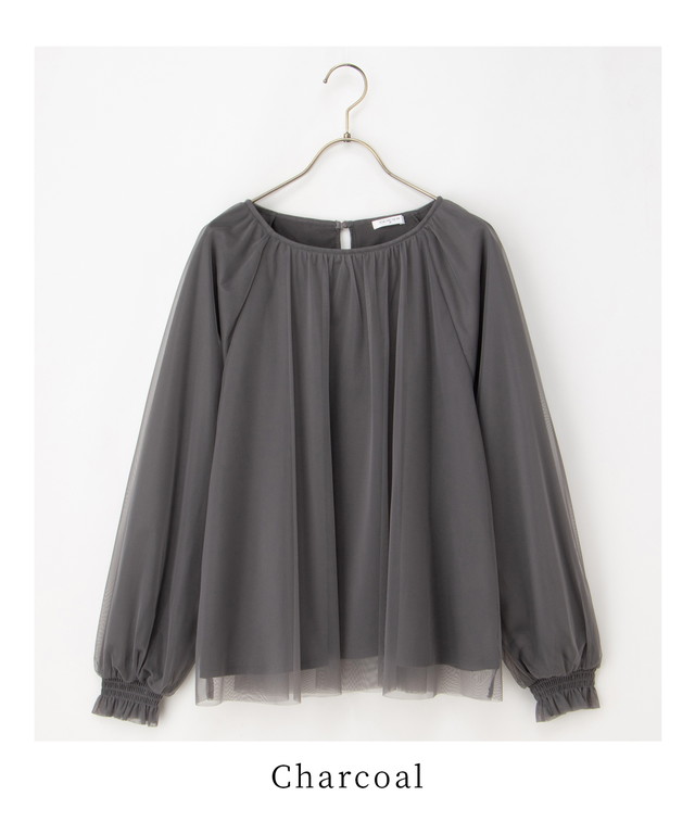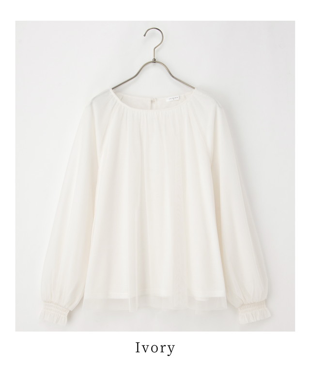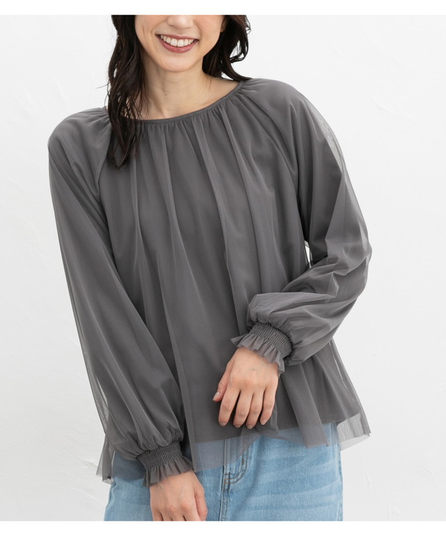 トップス カットソー 長袖 チュール フェミニン 体型カバー ギャザー 裏地付き 無地 レディース SALE セール Honeys ハニーズ チュールトップス