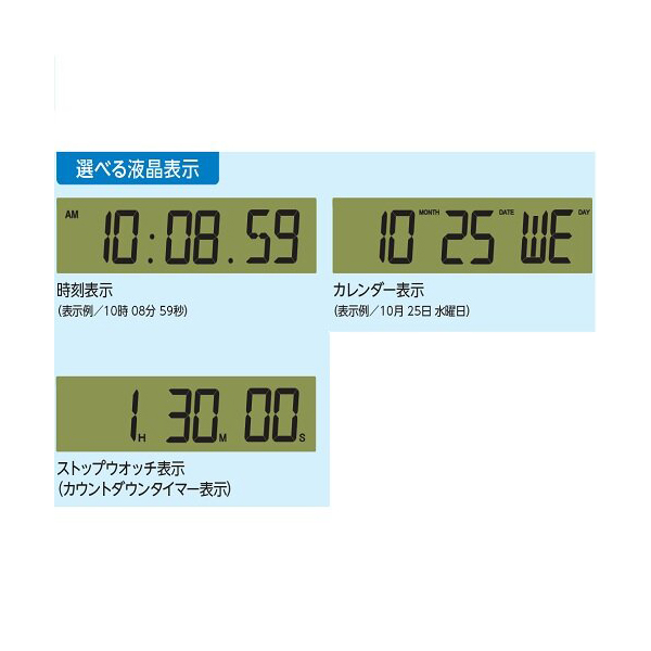 | 機能 | 掛置兼用 電子音アラーム(5分間オートストップ) スヌーズ ライト 2099年までのフルオートカレンダー機能 カウントダウンタイマー機能(最大99時間59分59秒) ストップウオッチ機能(最大99時間59分59秒) 12時間制/24時間制切替式 時刻/カレンダー/ストップウオッチ・タイマー表示切り替え スタンドつき |