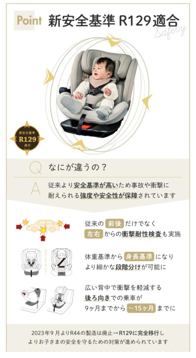 「R129」とはチャイルドシートの安全性を従来の「R44」よりさらに向上させるために制定された新しい安全基準です。従来より基準値が高いため事故や衝撃から耐えられる安全性が保障されています。