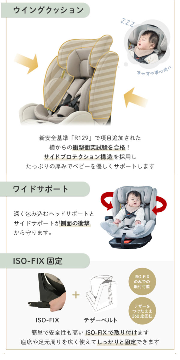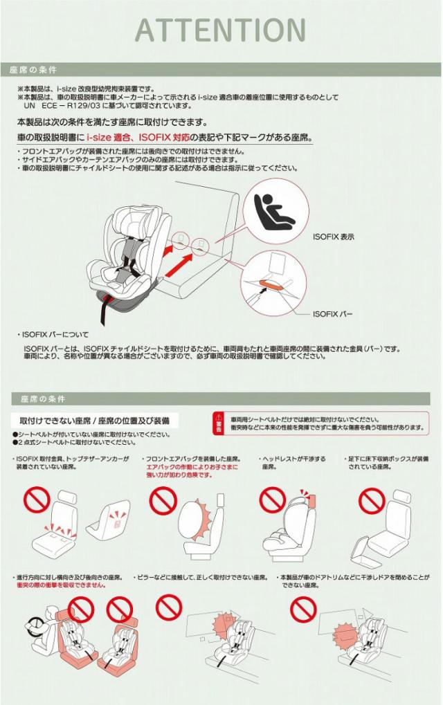 | 備考 | 適応身長:40cm〜150cm 固定方法:ISOFIX固定/もしくは ISOFIX+テザーベルト固定 ※Eマーク取得済み |