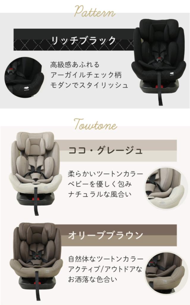 商品デザイナーが数100種類の生地の中から選んだとっておきの3色。それぞれツートンデザインがおしゃれで、チャイルドシートでは今まで見たことがなかったような高いデザイン性が追求された商品です。
