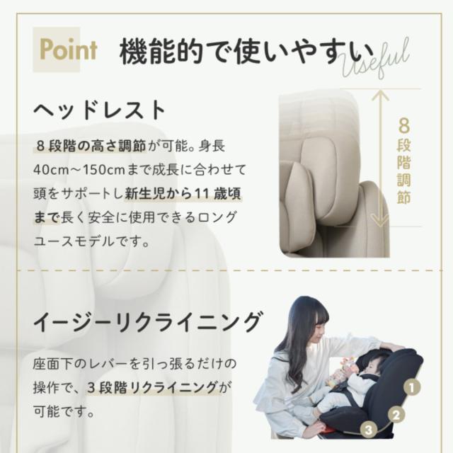 ベビーの快適さはもちろん、ママ・パパがより使いやすいよう細部まで行き届いた機能性を追求。8段階ヘッドレストや肩ベルト調節機能が標準装備されています。