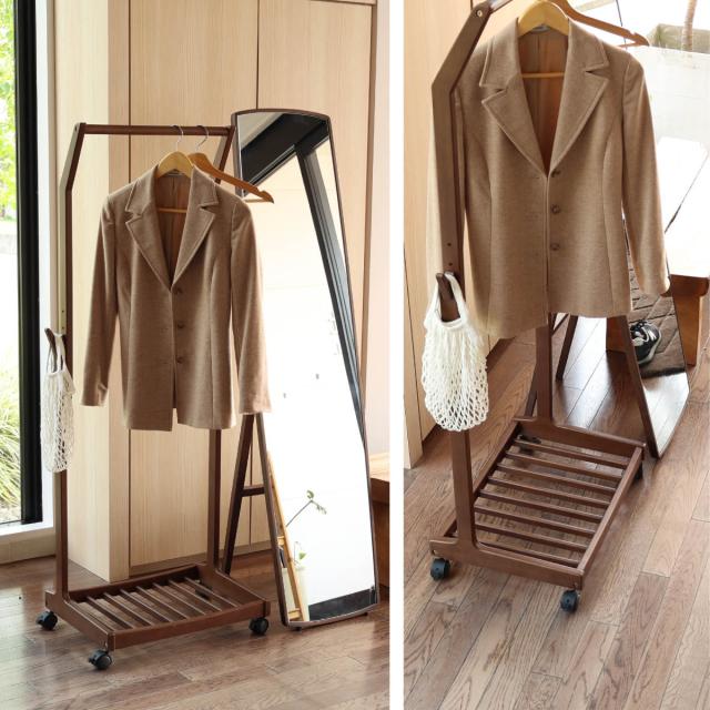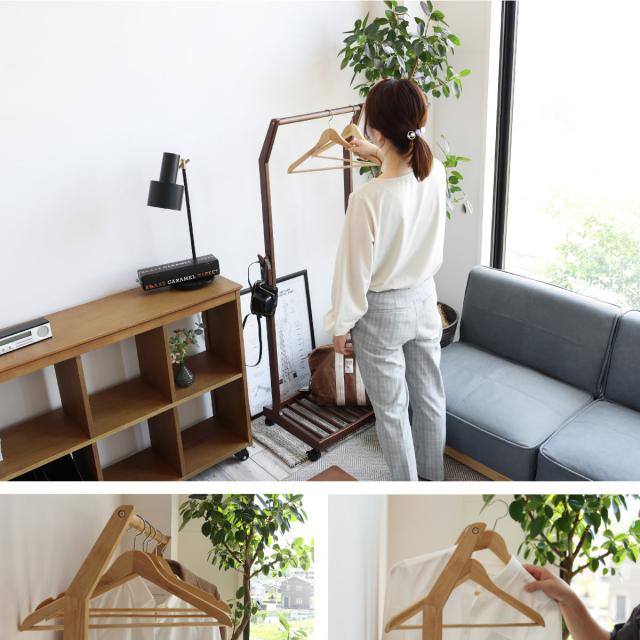 角度があることでハンガーが取りやすく、掛けている服が壁に当たりにくいなど良いことずくめ。横から服が見やすいので身支度もスムーズにできます。