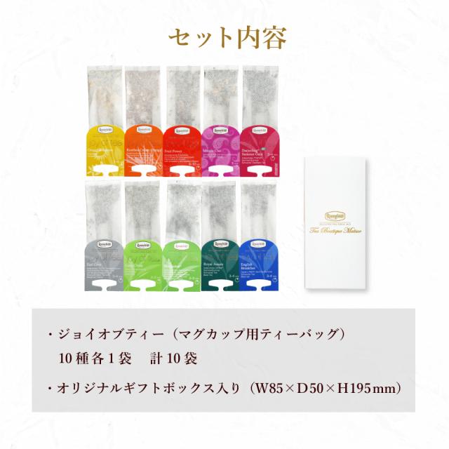 こちらのギフトセットには、ジョイオブティー10種が1袋ずつ入っており、バラエティ豊かなティーを楽しめる贈り物として最適です。