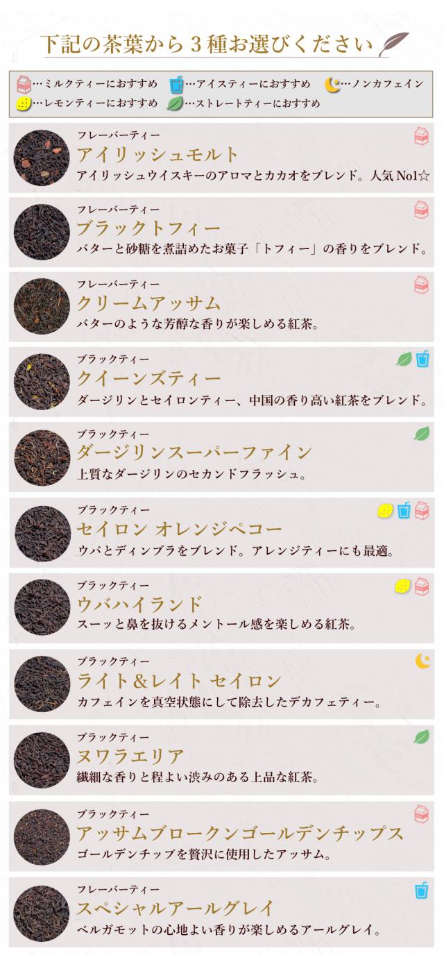 (※お選びいただく3点は、必ず3点とも違う茶葉をご選択下さい。重複している場合は、ご変更いただくまでご出荷できませんのでご注意ください。)