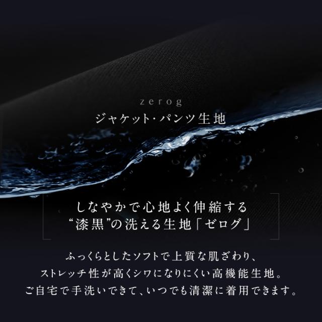 緩やかなカーブが優しい印象を与えるノーカラージャケットと、全周ゴムギャザーウエストで快適なパンツ。ふっくらとしたソフトで上質な肌ざわり、ストレッチ性が高くシワになりにくい高機能生地「ゼログ」を使用しており、ご自宅で手洗いできていつでも清潔に着用できます。