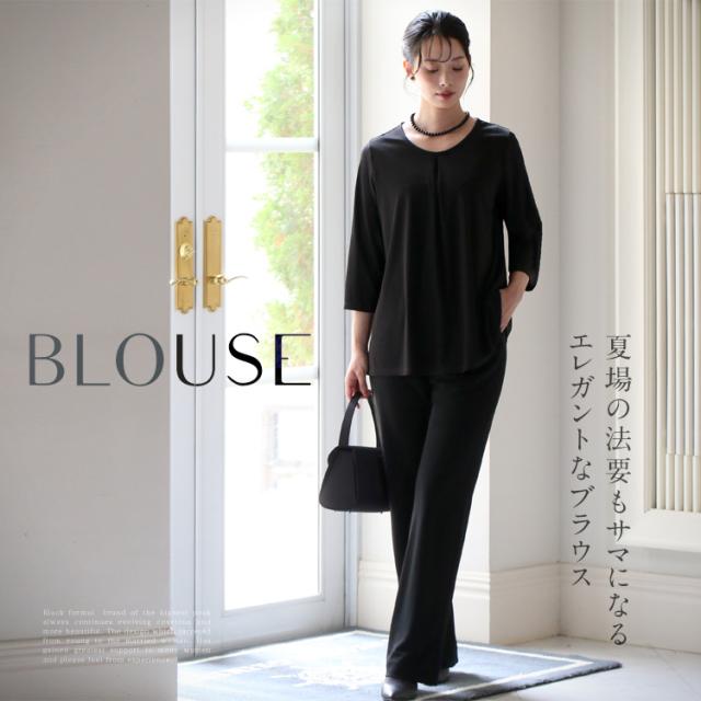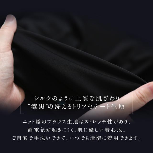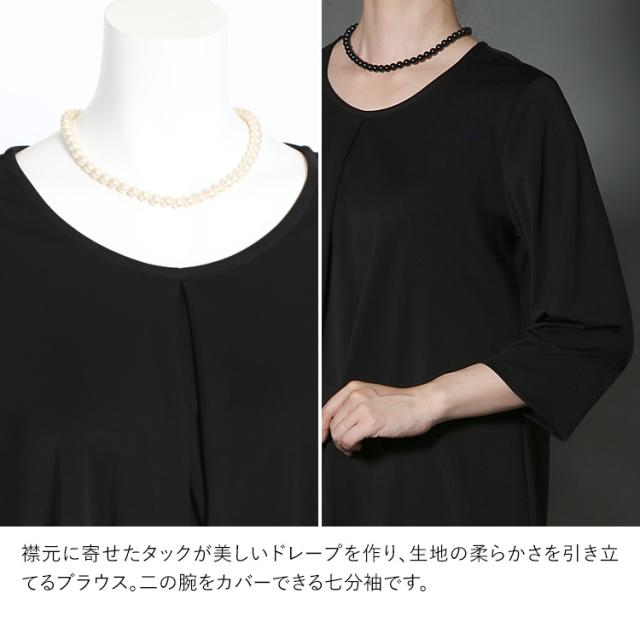 襟元に寄せたタックが美しいドレープを作り、生地の柔らかさを引き立てるブラウス。二の腕をカバーできる七分袖です。トリアセテート素材を使用したニット織のブラウス生地はストレッチ性があり、静電気が起きにくく、肌に優しい着心地に。