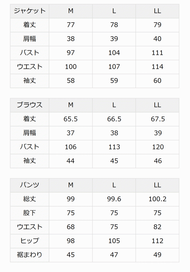| 表地 | ジャケット・パンツ:ポリエステル100% ブラウス:トリアセテート88%、ポリエステル12% |