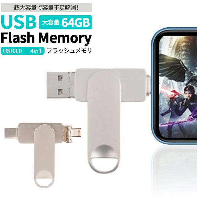 ポイント超超祭 USBメモリ 64GB USB3.0 4in1 usbメモリ 使い方初心者 高性能 高い互換性 タブレットPC カーオーディオ 音楽プレーヤー用
