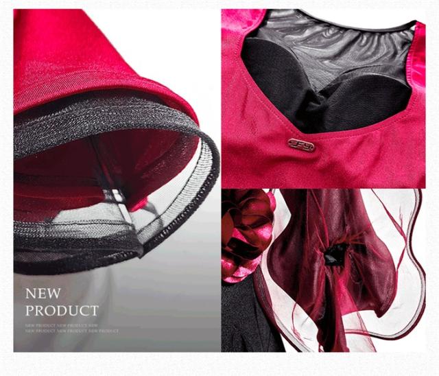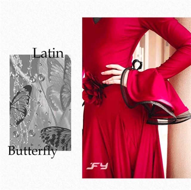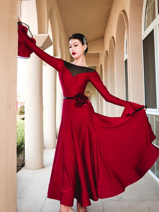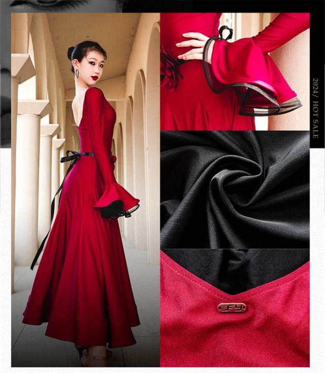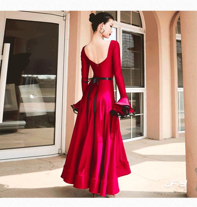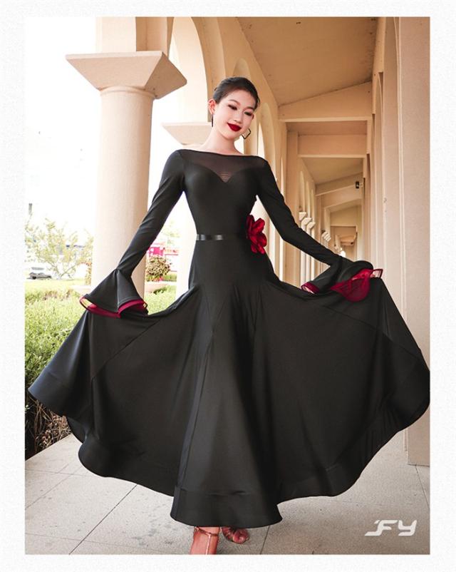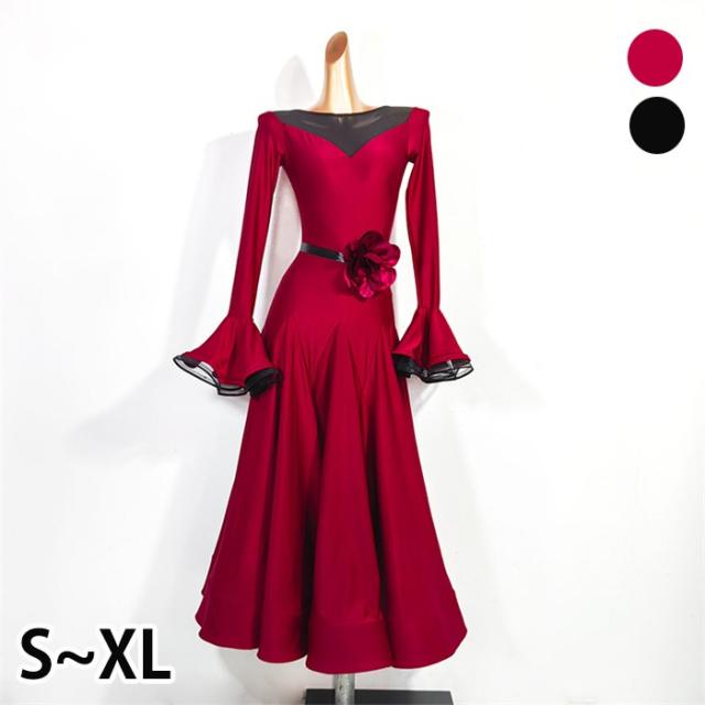 社交ダンスドレス モダンドレス 黒 赤 社交ダンス衣装 社交ダンス ドレス 衣装 長袖 大きい裾 スタンダードドレス ワルツダンス ワンピースドレス ステージ衣装 競技会 パーティー 発表会 競技着 練習着 舞台 演奏会 演出 ブラック ワインレッド