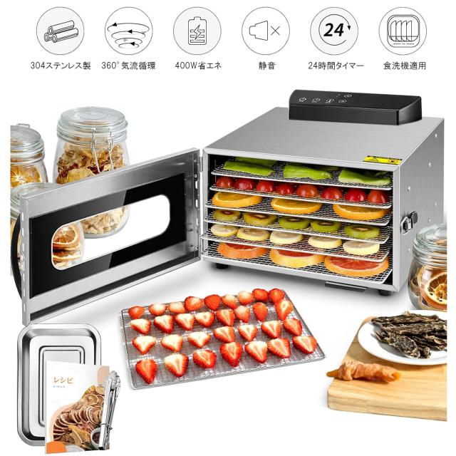 食品乾燥機 6層 フードドライヤー クッキー乾燥機 電気食品脱水機 ドライフルーツ 304ステンレス鋼製 LCD智能温度制御 24時間タイマー 食品グレード 野菜 お茶