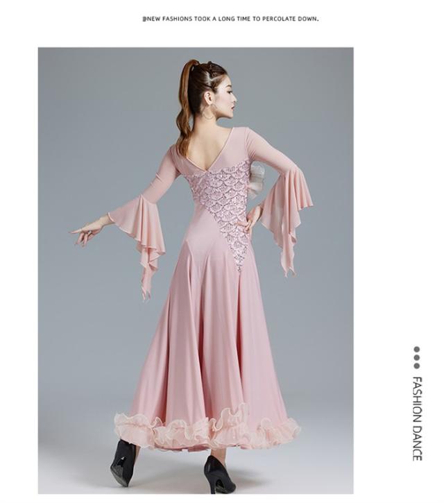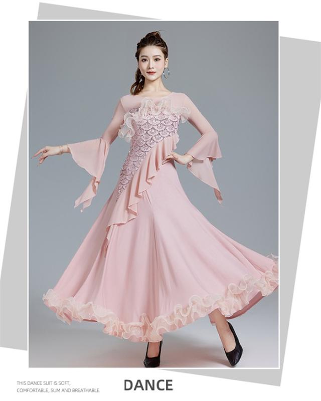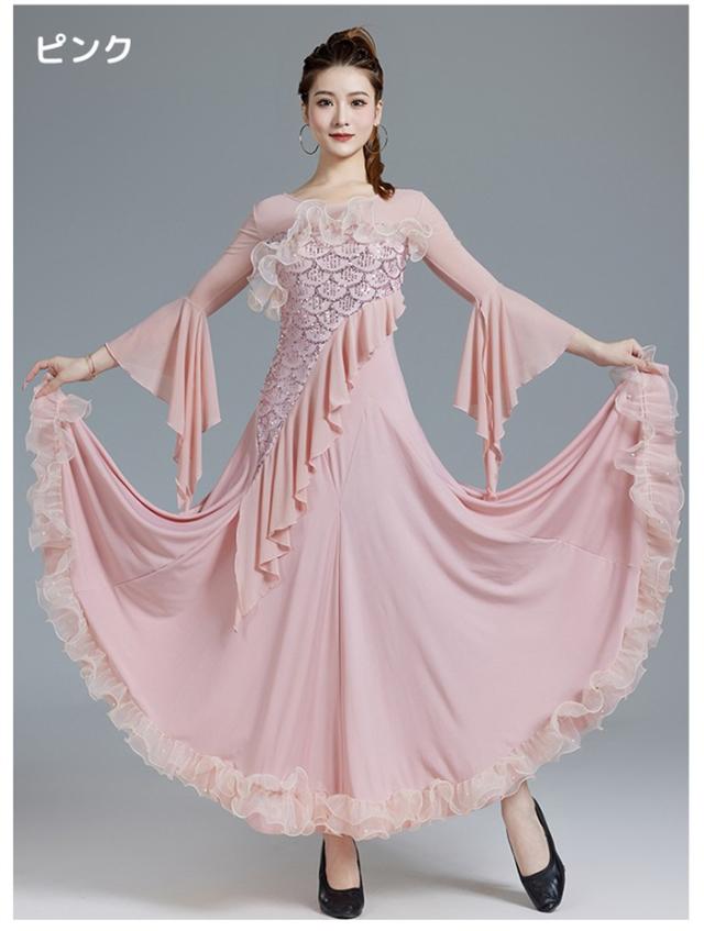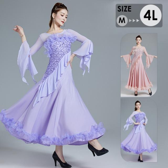 社交ダンスドレス 社交ダンス モダンドレス ピンク パープル 大きいサイズ 長袖 大きい裾 スタンダードドレス ワルツダンス ワンピースドレス ダンス衣装 ダンスウェア ステージ衣装 競技会 パーティー 発表会 競技着 練習着 舞台 演奏会 演出