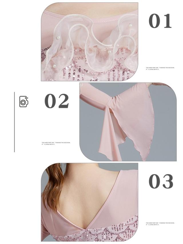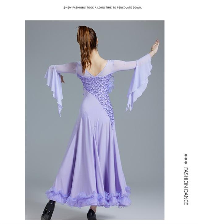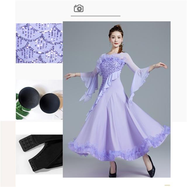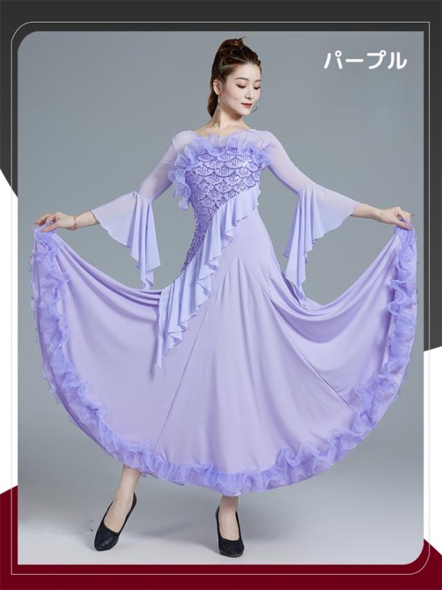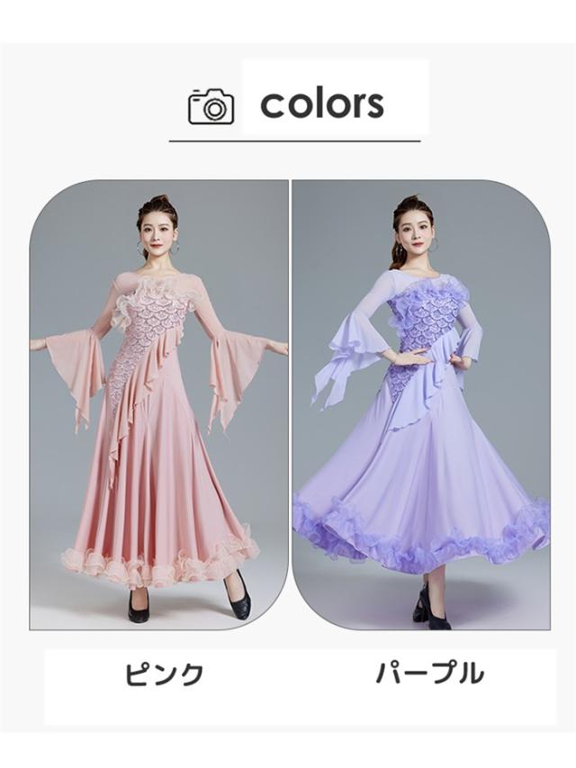 【商品名】社交ダンスドレス 社交ダンス モダンドレス ピンク パープル 大きいサイズ 長袖 大きい裾 スタンダードドレス ワルツダンス ワンピースドレス ダンス衣装 ダンスウェア ステージ衣装 競技会 パーティー 発表会 競技着 練習着 舞台 演奏会 演出