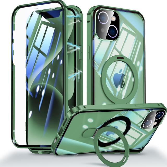 ◆商品名:OURJOY i Phone 15 用 ケース 【両面保護+MagSafe対応+ロック式+多機能一体スタンド】 ガラスケース クリア 360°全面保護 アイフォン15