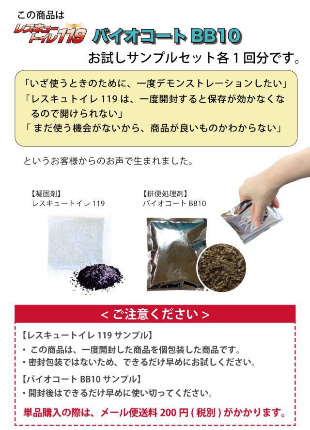 簡易トイレ 凝固剤 災害 災害用トイレ 備蓄トイレ [非常用トイレ お試しサンプルセット] レスキュートイレ119 バイオコートBB10 各1個 消臭成分 活性炭 非常用トイレ 凝固剤のみ 防災用簡易トイレ・排便処理剤 防災訓練 防災講習 仮設トイレ サンプル