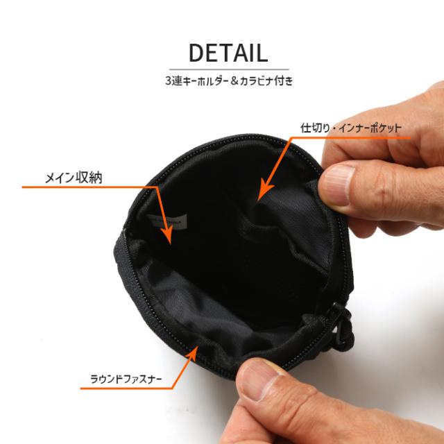 裏側にはカラビナ付き、3連キーホルダー付きでボトムスのウエストに引っ掛かけることも可能です。