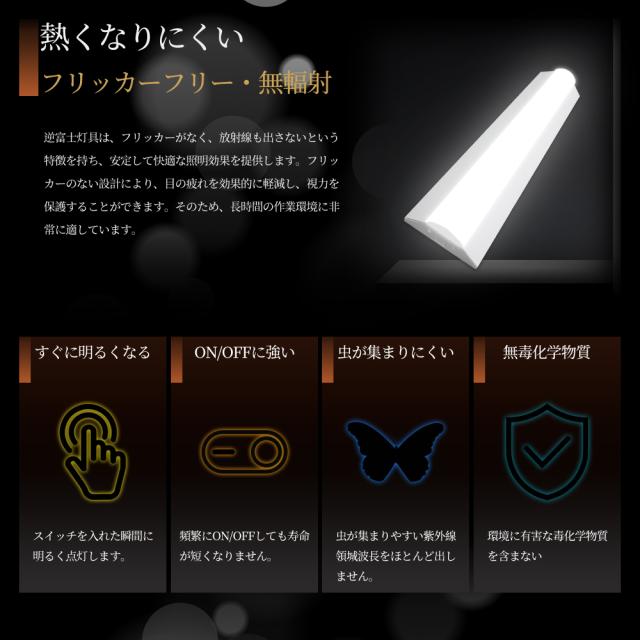 - 逆富士ライトは先進的なLED技術を採用しており、従来の電球や蛍光灯に比べて高いエネルギー効率を持っています。少ない電力で同じ明るさを提供できるため、電力の節約とコストの削減が可能です。
