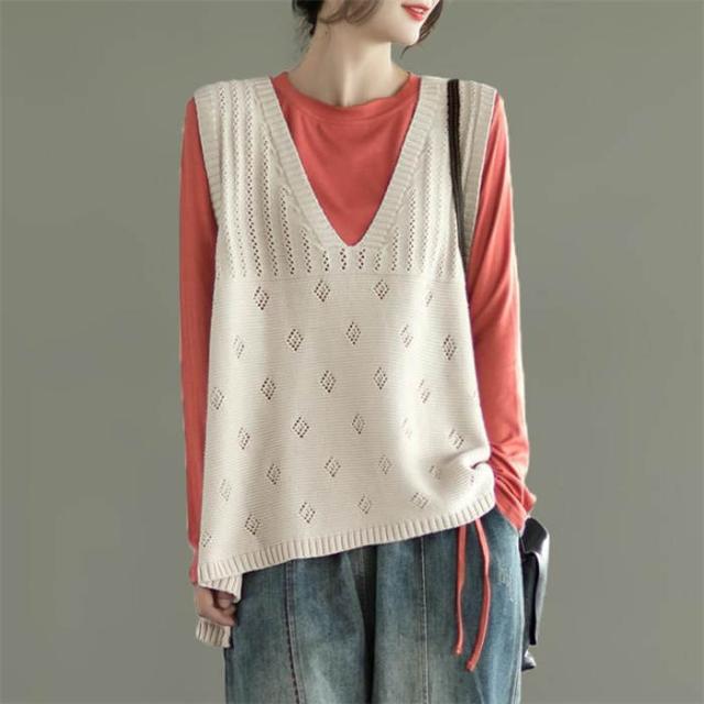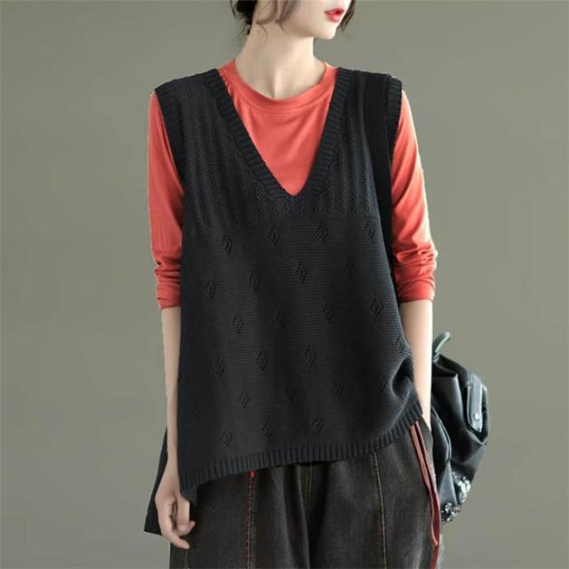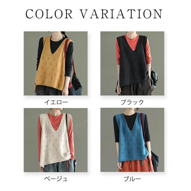 ニット ベスト レディース 春 秋 春秋 トップス チョッキ ニットベスト 春ベスト おしゃれ 着回し 体型カバー ノースリーブ Vネック 無地 透かし編み 裾前後差 20代 30代 40代 50代