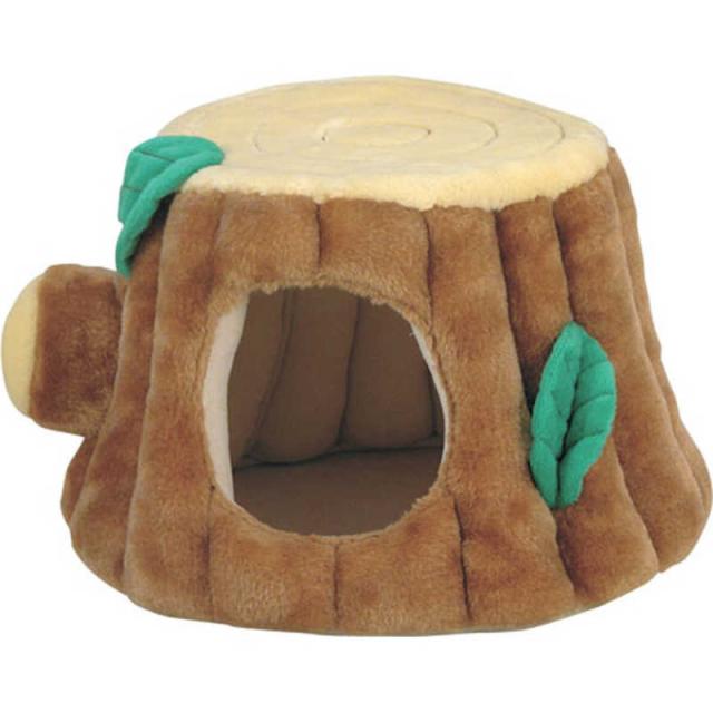 切り株に木の葉をあしらった自然なデザイン。なめらかなフェイクファー仕上げ。ウサギやフェレットなどの隠れ家に最適!ズレ防止用背面メタルフック付き!