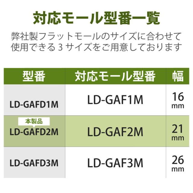 フラットモールの蓋の上からかぶせるだけ。配線の際のケーブルを保護し、すっきりと収納できるフラットモール(LD-GAF2M)用のジョイントパーツ(出ズミ)。