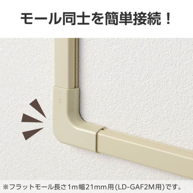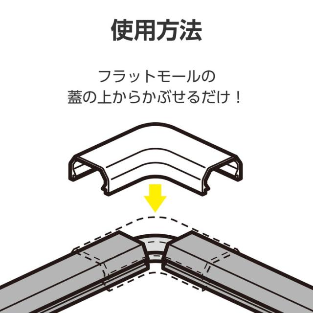 フラットモールの蓋の上からかぶせるだけ。配線の際のケーブルを保護し、すっきりと収納できるフラットモール(LD-GAF2M)用のジョイントパーツ(曲ガリ)。