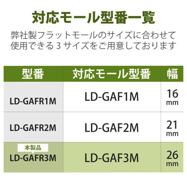 フラットモールの蓋の上からかぶせるだけ。配線の際のケーブルを保護し、すっきりと収納できるフラットモール(LD-GAF3M)用のジョイントパーツ(入ズミ)。