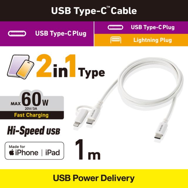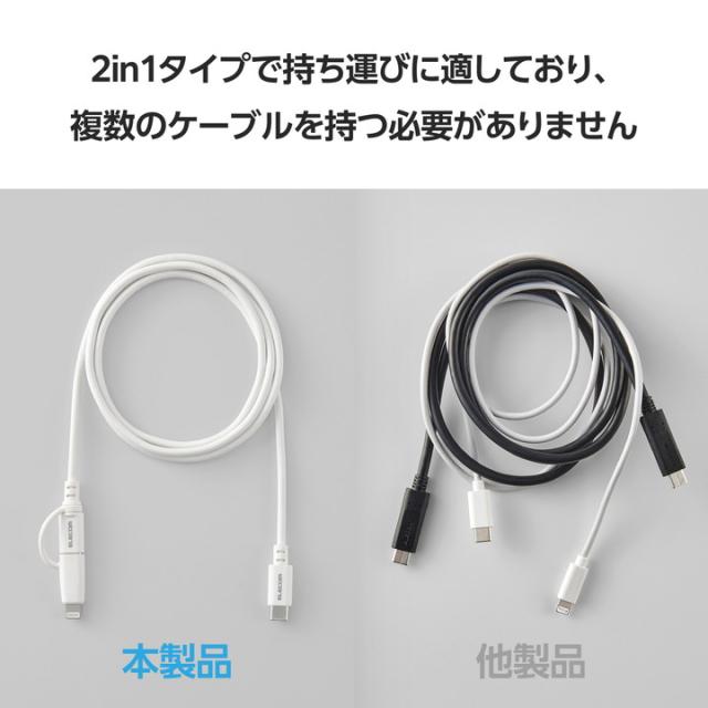 エレコム 2in1 USBケーブル Type-C - USB Type-C Lightning変換 MFi認証 USB Power Delivery対応 1.0m ホワイト ┃MPA-CCLAD10WH