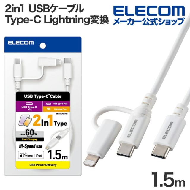 エレコム 2in1 USBケーブル Type-C - USB Type-C Lightning変換 MFi認証 USB Power Delivery対応 1.5m ホワイト ┃MPA-CCLAD15WH
