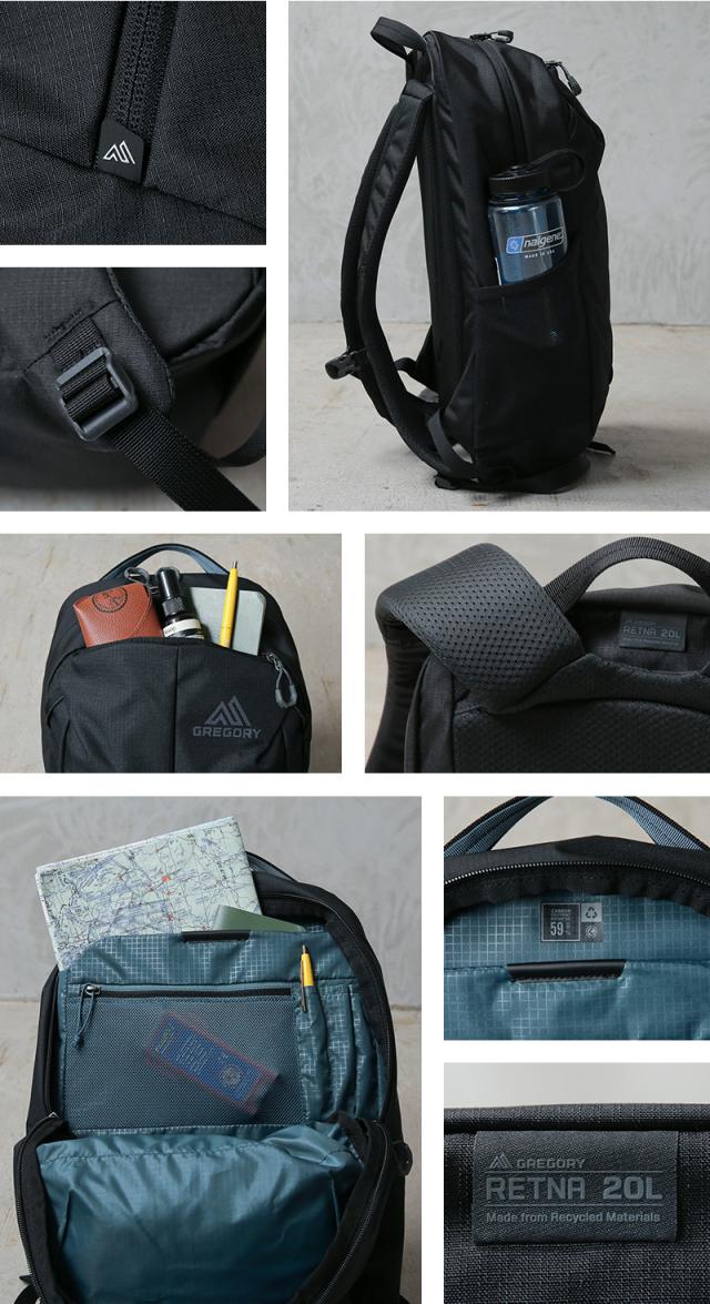 GREGORY グレゴリー RETNA レトナ 20L バックパックのご紹介です。快適さ、スタイル、シンプルさを重視して作られている、レトナコレクションより、ポップでスタイリッシュなバッグパックの登場です。大きく3つのコンパートメントがあり、メインはコの字開閉式で出し入れしやすく、15インチまで収納できるノートパソコン用スリーブと、タブレット/ドキュメントスリーブ。 ジッパー付きメッシュポケットとペンスロットまで完備。 フロントポケットは底が深すぎないので、財布や携帯電話などの使用頻度の高いものも収納可能。また多密度フォームバックパネルとエアメッシュ、パッドにより夏でも快適な持ち運びを実現。シンプルなデザインと機能的な収納力で通勤通学の普段使いから、レジャーやアウトドア、キャンプ、旅行など様々なシーンで活躍するアイテムです。